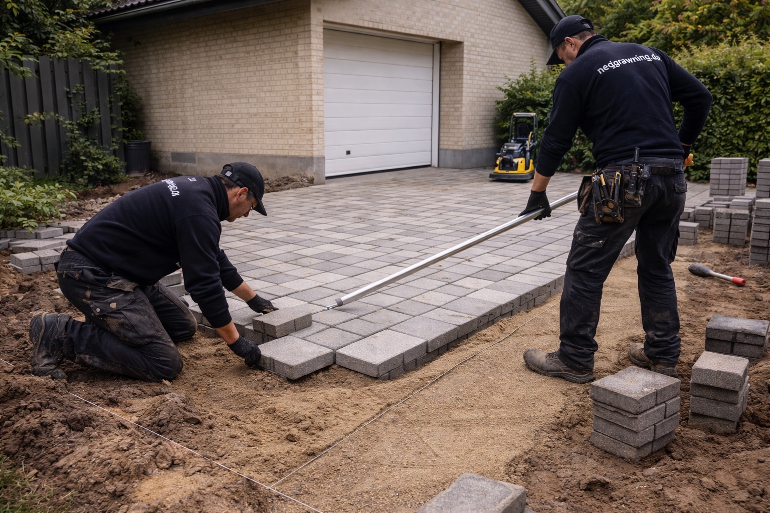 De fleste belægningsproblemer — sætninger, forskudte fliser, vandpytter — skyldes et dårligt fundament. Udgravning til korrekt dybde og grundig komprimering er vigtigere end selve belægningen. Al muld og råjord skal fjernes, så der opnås en fast og drænfærdig bund. Der graves en rende til udlægning af stabilgrus og kantsikring. Gruset fordeles og opbygningen kontrolleres løbende med en retskinne for korrekt højde og fald.